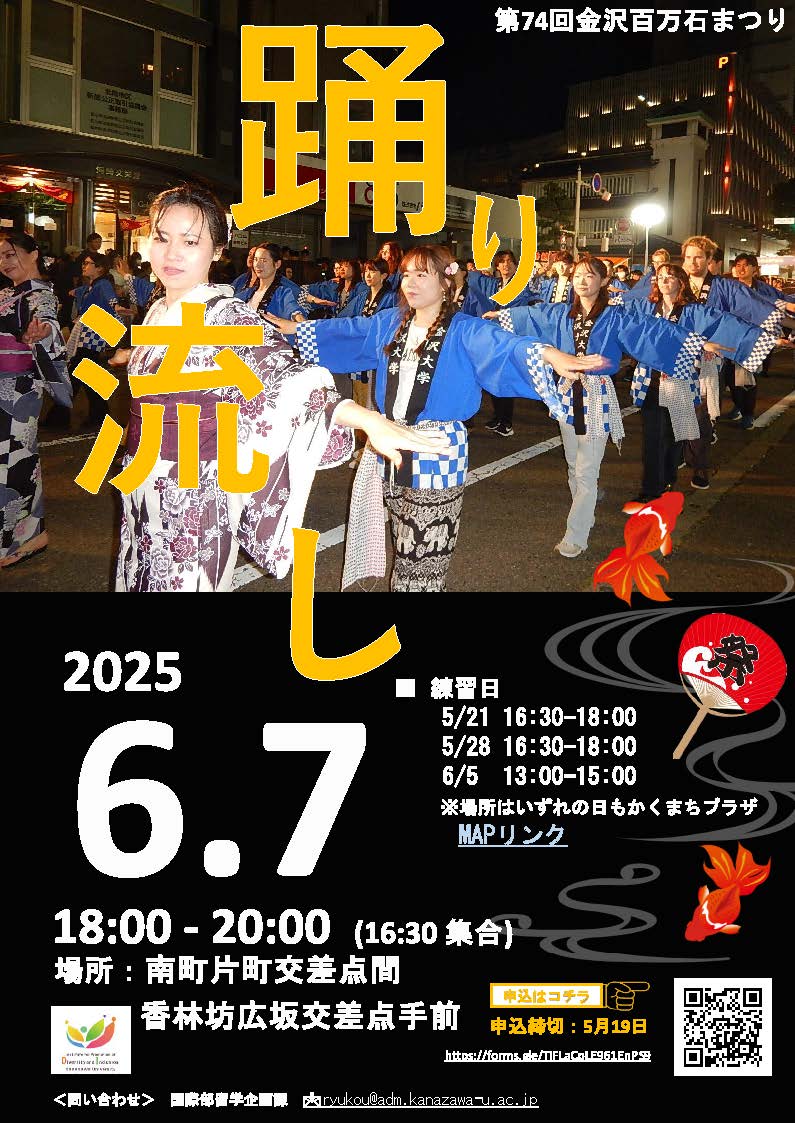 6月7日に実施される「百万石踊り流し」に金沢大学の一員として参加する学生を募集します!金沢を代表するお祭りで一緒に踊りませんか?添付のチラシを確認の上、参加を希望する場合は、5月19日までに申込フォームからお申込みください。