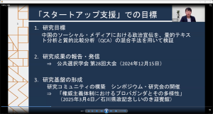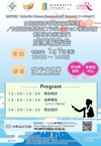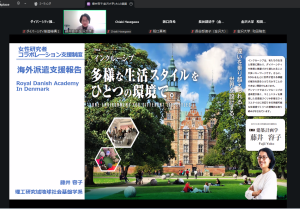 1月7日、「女性研究者等研究支援制度/女性研究者研究コラボレーション支援制度海外派遣部門 成果報告会」をオンライン形式にて開催し,学内関係者約20名が参加しました。