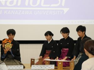The gathering began with an opening address by President Wada Takashi. In his speech, he mentioned that Kanazawa University has been selected for the Ministry of Education, Culture, Sports, Science and Technology ” Project for Creating World-Class Graduate Education Hubs to Lead the Future (FLAGs) “and stated its commitment to strengthening the development of next-generation doctoral talent who will lead the future. Next, the Noh chanting and small drum performance by the Kanazawa University Noh Circle “Hosho-kai,” followed by presentations by international students introducing their home universities and highlighting the attractions of Kanazawa University, enlivened the venue. The gathering became livelier, accompanied by the smooth facilitation of Assistant Professor Tomoya Sato from the International Center for Japanese Studies and Education.
